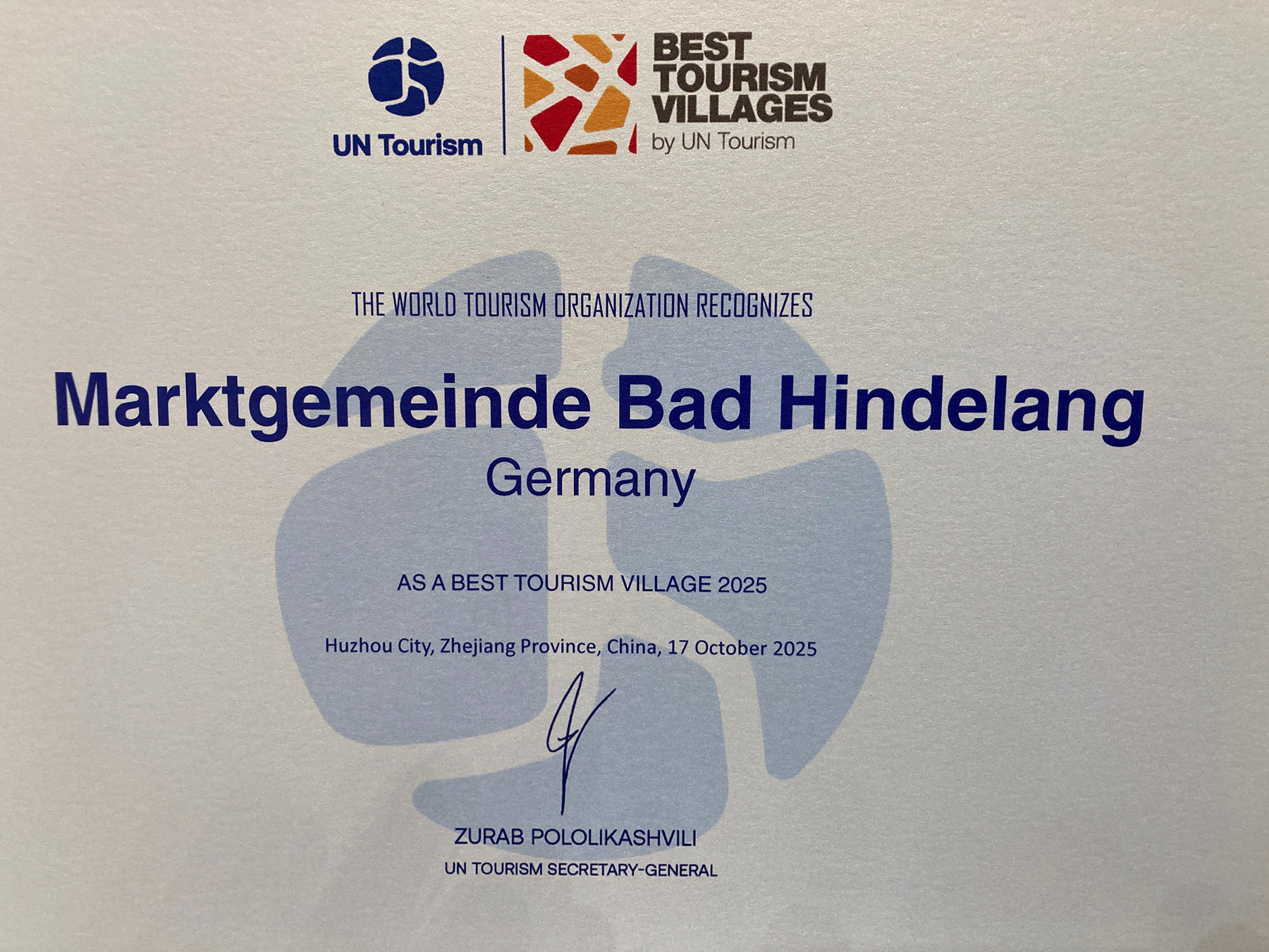 Großer Jubel in der Marktgemeinde Bad Hindelang: Der beliebte Ferienort in den Allgäuer Hochalpen ist jetzt im Rahmen des weltweiten Wettbewerbs „Best Tourism Villages by UN Tourism“ in Huzhou (China) ausgezeichnet worden. Bad Hindelang wurde dafür geehrt, dass sich die Gemeinde in besonderem Maße in den Bereichen Nachhaltigkeit, kulturelles Erbe und zukunftsfähiger Tourismus engagiert.